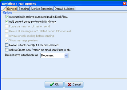 Setup General Preferences •Select the General tab •Check the option: Automatically archive outbound email on send. This will cause an ActivityHistory record to be created each time an email is sent from Deskflow •Check the option: Add current Company to activity history. If the recipient People.Type is Contact. then a link to the ActivityHistory record will be created in the Company for which the person works. •Set Default save attachment as Document if you are not a Recruiter. •Set Default save attachment as Resume if you are a Recruiter.